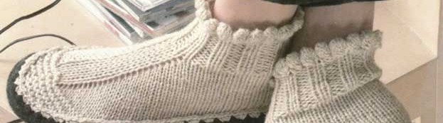 A legcélszerűbb, ha felhúzzuk a lábunkra a kötött cipőt, és a talpat óvatosan felgombostűzzük és férceljük a kötött darabra. Ezután a horgolt szegély mentén szépen rávarrjuk.
