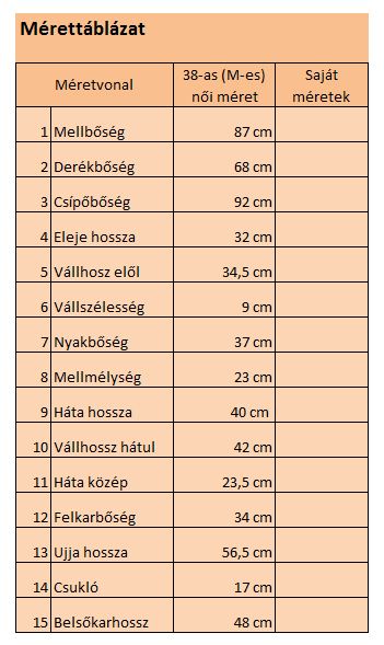 15 Belsőkarhossz – a hónaljtól a csuklóig mérjük.