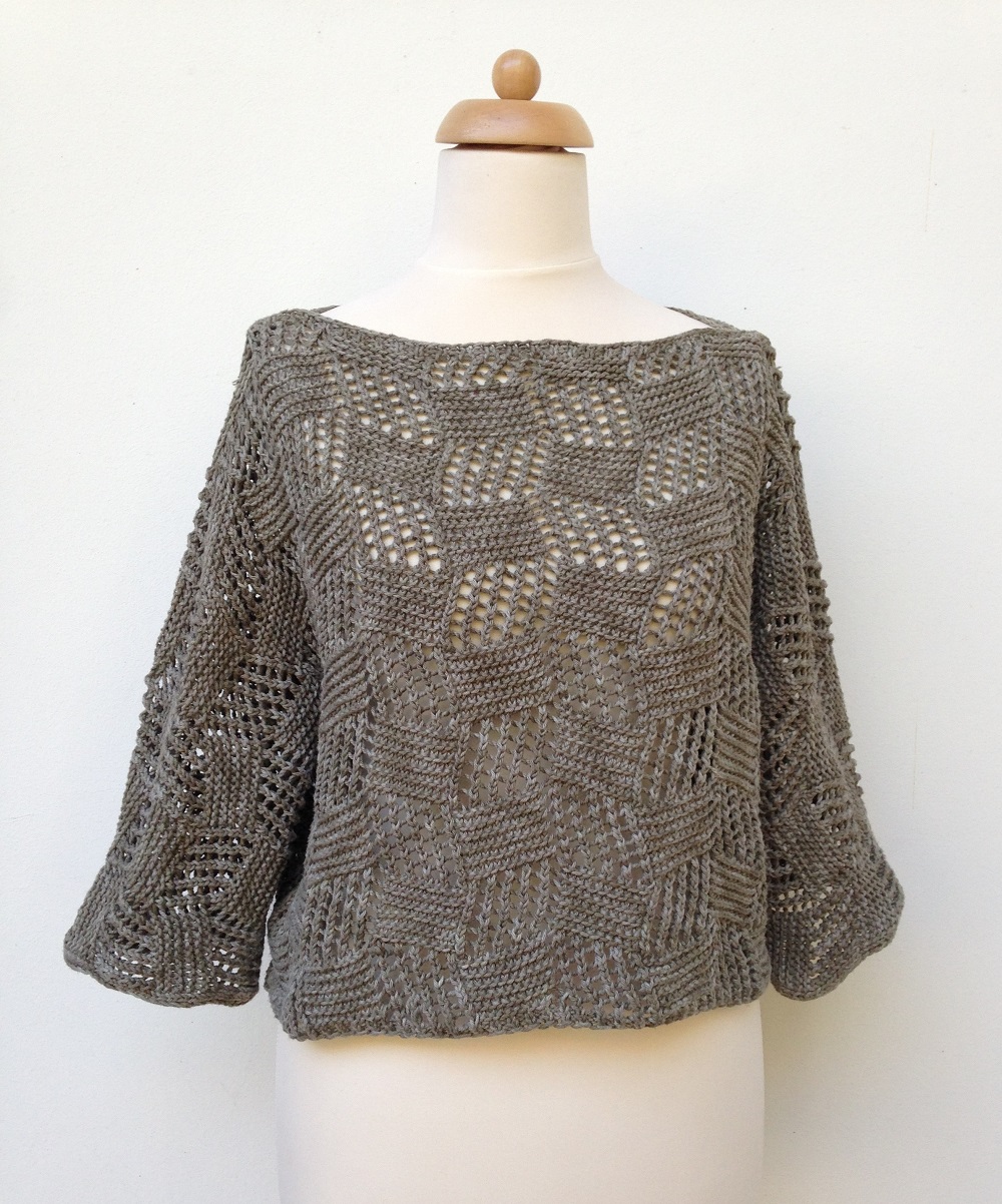 Rövid, laza nyári pulóver T fazon, áttört mintával kötve