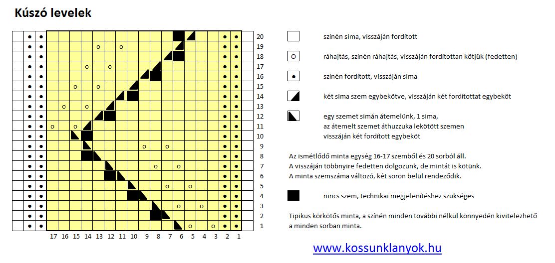 A mintának a színe van felrajzolva, ahogy látjuk megkötve, ha körbe kötünk mindig jobbról dolgozunk,a visszáján is mintát kötünk ezért könnyebb is körbe kötni így mindig a színén dolgozunk. Eltérő a szemszám soronként írom is a megjegyzésekbe, két soron belül rendeződnek a szemek, minden sorban összekötünk, de csak a színe sorokban szaporítunk. Kitartás, olvasd el figyelmesen a megjegyzéseket is és menni fog!