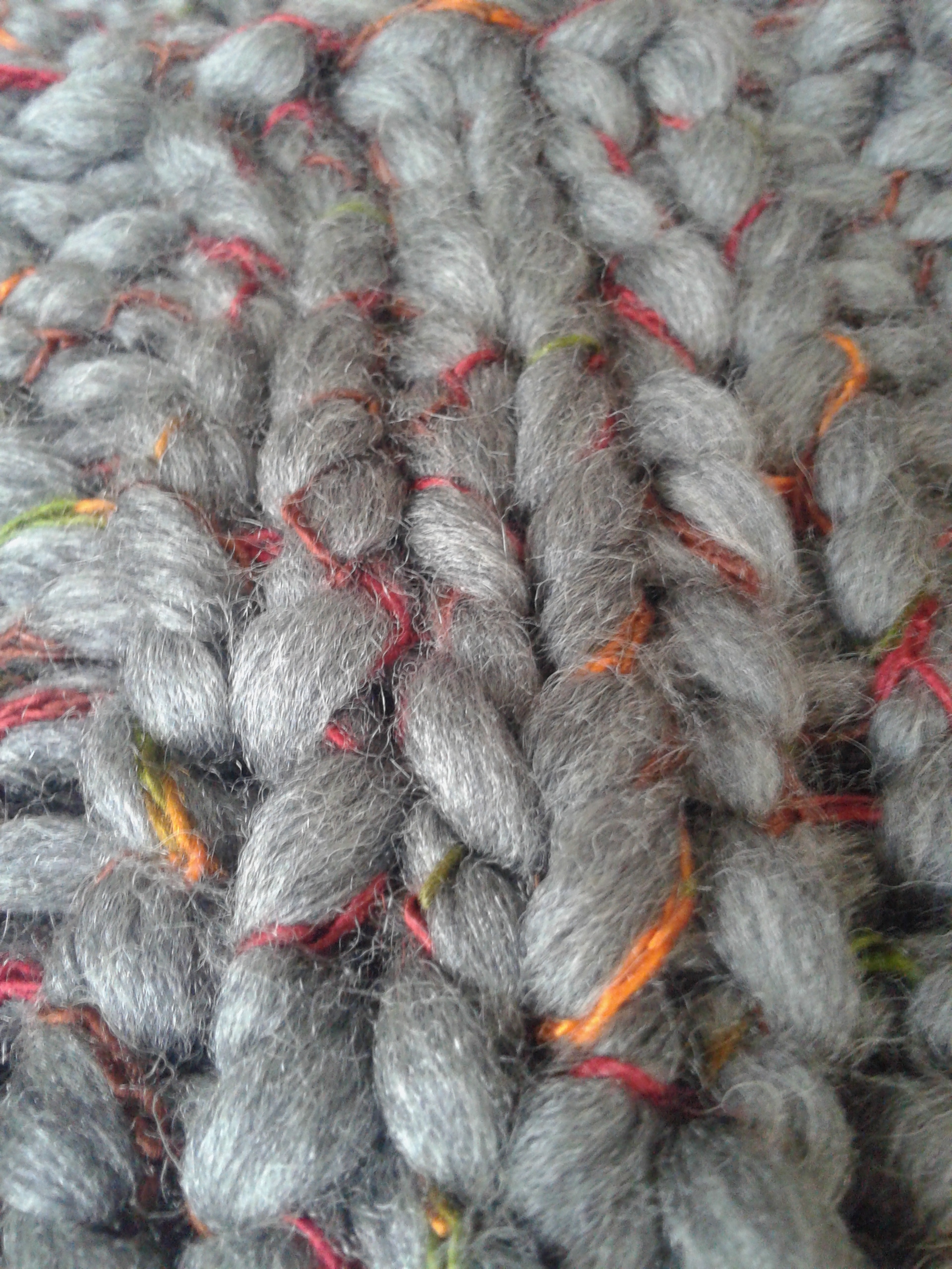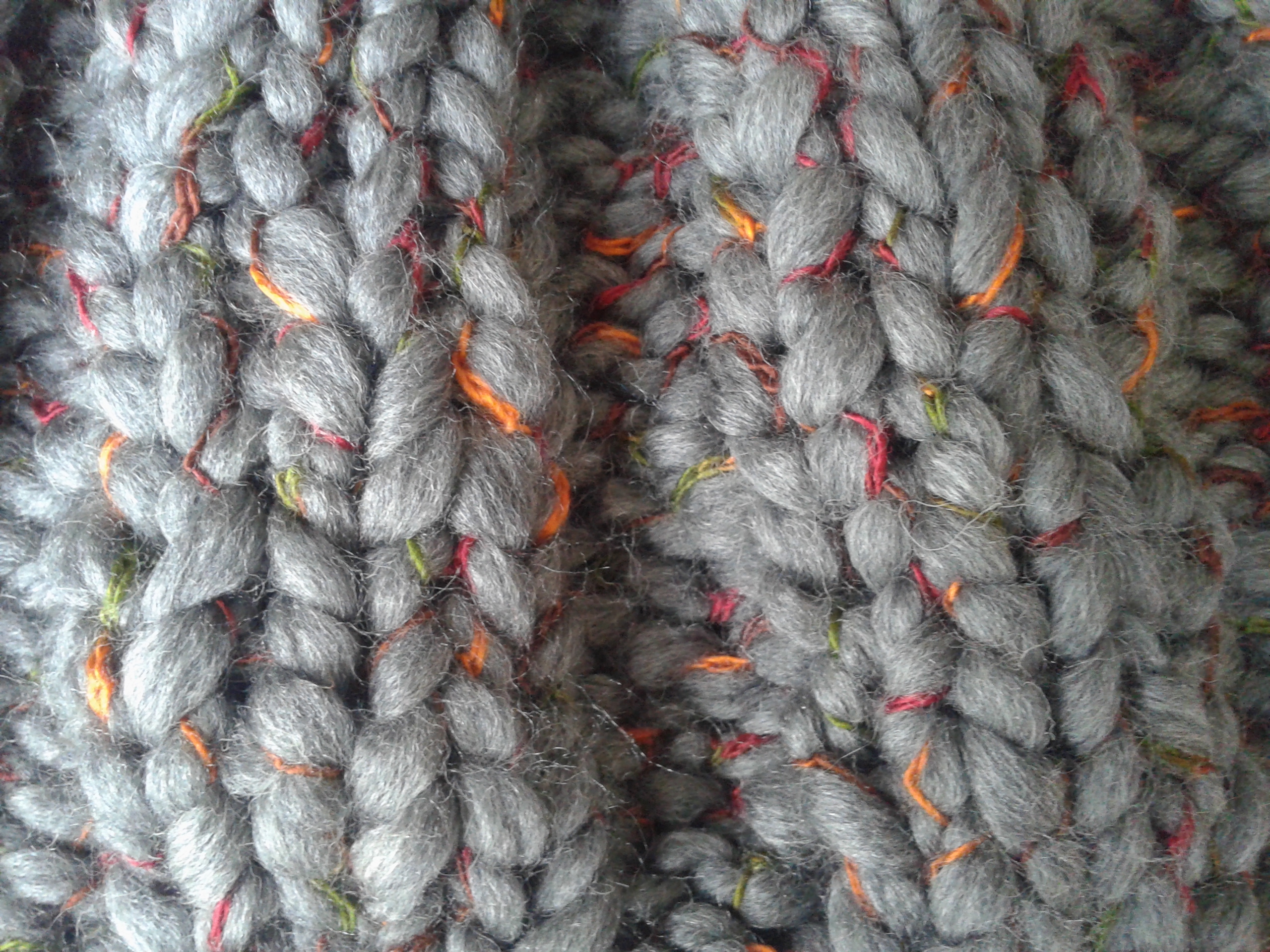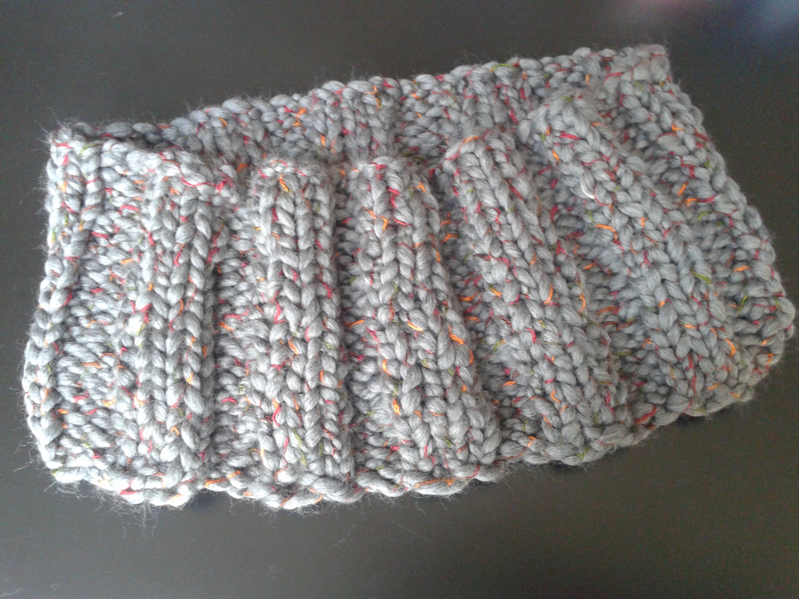 Körbe kötöttem három sima, három fordított mintával addig kötöttem míg felhasználtam két gombolyagnyi fonalat.