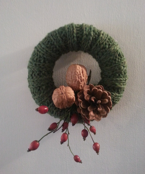 Kötött adventi koszorú, egy koszorú alapot kötéssel vontam be, termésekkel díszítettem.