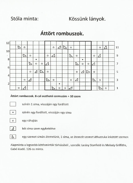 Kezdő szemszám 70, 64 a minta 3-3 szélszemek. A minta ábrája lent található. Ha szélesebbre szeretnénk a stólát egy egy mintaegység 8 szemből áll és kb. 5 cm.- nek felel meg.